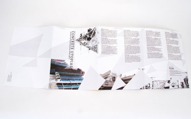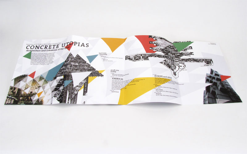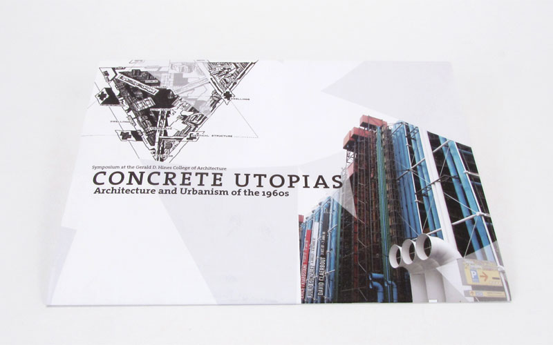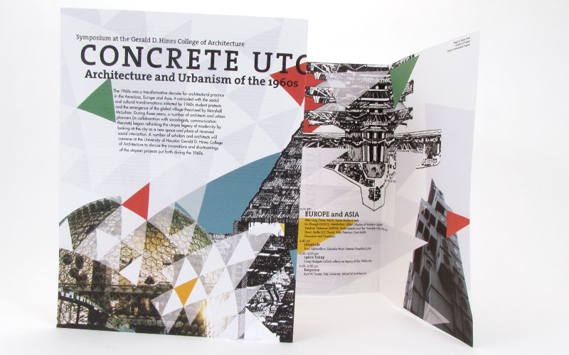 An all-in-one project, functioning as a poster, a mailer, and a program designed for a sponsored event of the University of Houston College of Architecture. Architectural references from the 1960s, the Concrete Utopia poster represents the look and feel of the architectural passion of the period. It uses vibrant colors and geometric shapes that are indicative of the architectural design of the period.